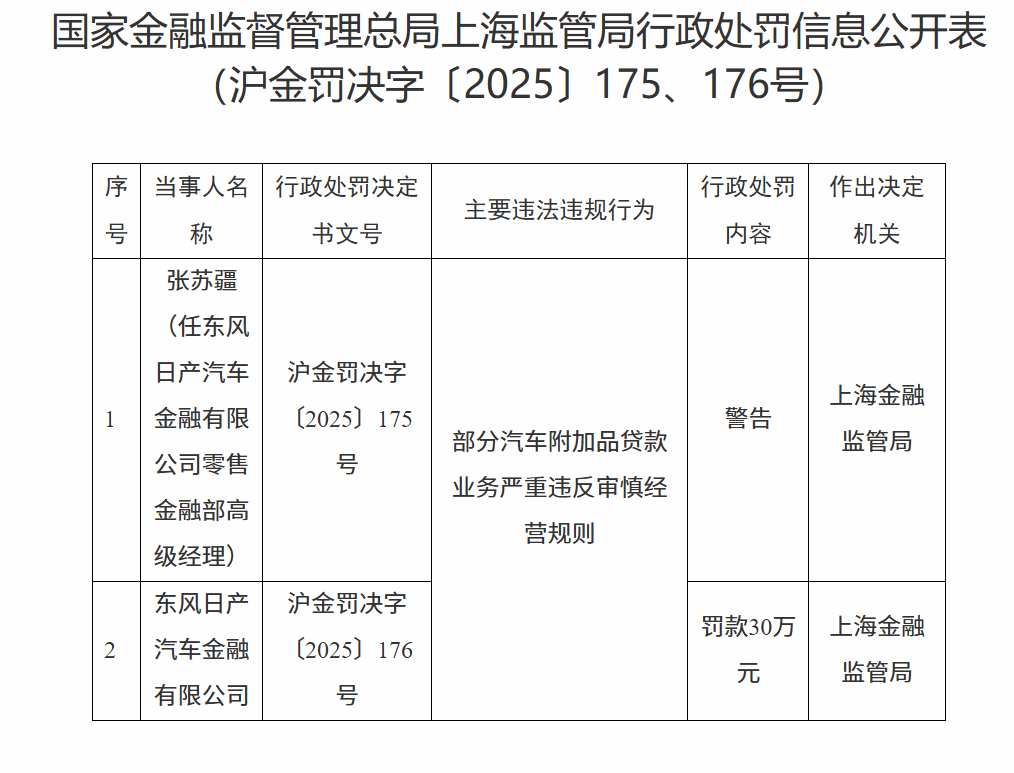 10月17日,国家金融监督管理总局上海监管局行政处罚信息公开表显示,东风日产汽车金融有限公司因部分汽车附加品贷款业务严重违反审慎经营规则被罚款30万元;张某疆被警告。